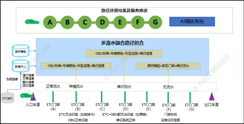 本文針對ETC識讀率低、牌識流水與抓拍率低、假冒減免車輛、套牌、路徑作弊等收費問題,搭建了AI稽核系統(tǒng)平臺,實現(xiàn)了多源異構(gòu)數(shù)據(jù)的采集、存儲、處理與分析。在深度融合ETC門架、收費站等流水和圖像信息的基礎(chǔ)上,提出了多流水融合路徑擬合方法真實還原了通行過程車輛信息,為偷逃漏通行費稽核提供了完整證據(jù)鏈。同時,深度分析了所轄區(qū)域2020年5月至2021年12月間數(shù)據(jù),結(jié)果表明,AI稽核系統(tǒng)模型準確率較高,可有效防范和遏制偷逃漏通行費行為,提升稽核追繳成功率。