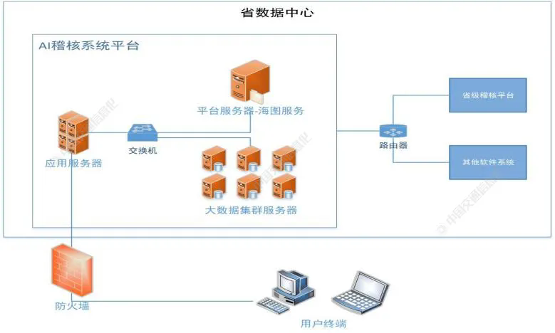 數(shù)據(jù)源是開展收費稽核工作的基礎(chǔ),包括通行、交易、牌識、視頻等采集數(shù)據(jù)和車輛發(fā)行、路網(wǎng)、費率、節(jié)點等基礎(chǔ)數(shù)據(jù),具體如下[8]。1、車道收費數(shù)據(jù)具體包括車道收費交易數(shù)據(jù)和車道牌識數(shù)據(jù),其中車道收費交易數(shù)據(jù)包括出入口站點、出入口時間、車牌、車型、軸重、軸數(shù)、行駛里程、收費金額等;車道收費牌識數(shù)據(jù)包括收費站編號、抓拍時間、識別車牌號、識別車型、抓拍圖片等。2、門架計費數(shù)據(jù)和牌識數(shù)據(jù)具體包括門架計費交易數(shù)據(jù)和門架牌識數(shù)據(jù),其中,門架計費交易數(shù)據(jù)包括入口信息、交易時間、車型、車牌、計費里程、計費金額等;門架牌識數(shù)據(jù)包括門架編號、抓拍時間、識別車牌號、識別車型、拍攝位置、抓拍圖片等。3、發(fā)行數(shù)據(jù)包括ETC和OBU的發(fā)行數(shù)據(jù),具體包括發(fā)行省份、發(fā)行時間、車牌、車型、顏色、圖片、軸數(shù)以及辦理人的相關(guān)信息。4、跨省拆分數(shù)據(jù)包括車輛跨省通行的車輛通行數(shù)據(jù)和收費數(shù)據(jù),具體包括車輛通行收費站出入口數(shù)據(jù)、車道交易數(shù)據(jù)、門架計費數(shù)據(jù)等信息。5、全省治超數(shù)據(jù)和治超牌識數(shù)據(jù)主要包括車輛通行數(shù)據(jù)、計重數(shù)據(jù)和牌識數(shù)據(jù),具體包括車輛通行時間、車牌、車型、軸重、軸型、圖片等數(shù)據(jù)。(二) AI稽核系統(tǒng)設(shè)計思路1、AI稽核網(wǎng)絡(luò)拓撲AI稽核系統(tǒng)采用了大數(shù)據(jù)集群服務(wù)器、地圖引擎服務(wù)器、應(yīng)用服務(wù)器,網(wǎng)絡(luò)拓撲如圖2所示。其中,大數(shù)據(jù)集群服務(wù)器主要對收費數(shù)據(jù)、發(fā)行數(shù)據(jù)、拆分數(shù)據(jù)、治超數(shù)據(jù)、牌識數(shù)據(jù)接收、存儲以及對稽核模型、路徑還原等進行計算,還能通過倒排索引對數(shù)據(jù)進行高性能檢索;地圖引擎服務(wù)器主要實現(xiàn)地圖圖層加載、路網(wǎng)模型計算;應(yīng)用服務(wù)器主要實現(xiàn)對AI稽核系統(tǒng)的部署和接口的數(shù)據(jù)交互。