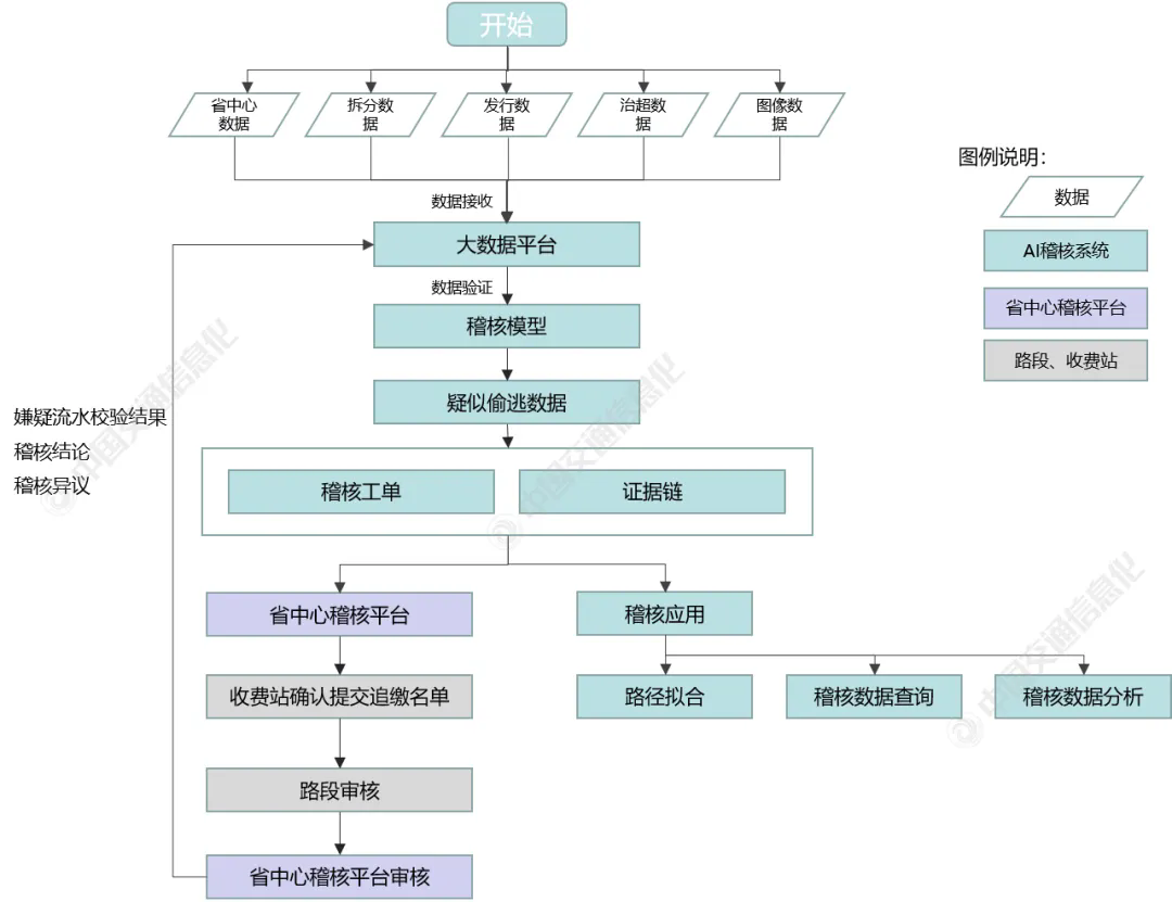 同時,鑒于數(shù)據(jù)存儲介質(zhì)、數(shù)據(jù)存儲類型和數(shù)據(jù)傳輸方式的差異,通過不同工具實現(xiàn)異源、異構(gòu)數(shù)據(jù)的導入。其中,對實時性要求較高的監(jiān)測數(shù)據(jù)以分布式消息隊列的形式由Kafka分發(fā);關(guān)系型數(shù)據(jù)庫由Sqoop等工具直接將數(shù)據(jù)導入HDFS;非實時性數(shù)據(jù)選擇MapReduce計算引擎,實時性要求較高的數(shù)據(jù)選擇Spark或Storm計算框架。3、AI稽核系統(tǒng)流程AI稽核系統(tǒng)流程如圖4所示,可分為4個步驟:(1)省中心數(shù)據(jù)、拆分數(shù)據(jù)、治超數(shù)據(jù)、發(fā)行數(shù)據(jù)等接收匯聚至大數(shù)據(jù)平臺,通過稽核模型數(shù)據(jù)驗證,得到疑似偷逃費數(shù)據(jù);(2)系統(tǒng)根據(jù)疑似偷逃費數(shù)據(jù),自動匹配生成稽核工單和證據(jù)鏈,并推送至省中心稽核平臺及稽核應(yīng)用;(3)省中心稽核平臺將稽核工單和證據(jù)鏈推送至收費站,一線稽核人員確認后提交追繳工單,工單提交至路段和省中心進行審核;(4)省中心稽核平臺審核完畢后,生成追繳名單,并反饋校驗結(jié)果、稽核結(jié)論等至AI稽核系統(tǒng)。