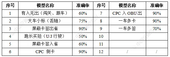 (四)稽核模型建立與準確率驗證本文所述AI稽核系統(tǒng)根據(jù)不同逃費類型建立對應(yīng)模型,目前已實現(xiàn)大車小標、有入無出、屏蔽卡簽入省、屏蔽卡簽出省、跑長買短、CPC倒卡、CPC入OBU出、一車多卡、一車多簽等近10種偷逃費行為稽核。以大車小標偷逃費行為進行舉例說明。改變車型(車種):大車小標是指發(fā)行車型跟實際車型不符。通過非法手段辦理或套取使用與實際車型不符的車輛標簽,達到偷逃費的目的?;藬?shù)據(jù)驗證方式如下:(1)通過交易數(shù)據(jù)中的車牌、車牌顏色和車型與發(fā)行數(shù)據(jù)對比,確定大車小標;(2)利用入口稱重數(shù)據(jù),在收費數(shù)據(jù)中的入口交易數(shù)據(jù)搜索軸數(shù)與車型不符的車輛;(3)搜索收費數(shù)據(jù)中的入口交易數(shù)據(jù),車型為一型貨車,且車牌顏色為黃色的車輛;(4)篩選車輛通過ETC專道和人工車道的收費車型存在不一致的情況,通過車牌號篩選某個車牌多次出現(xiàn)兩個及以上的車型的車輛;(5)對篩選出的車輛,根據(jù)大數(shù)據(jù)平臺圖片、交易數(shù)據(jù),對特征點進行對比分析,形成初步結(jié)論。通過對稽核模型分析數(shù)據(jù)與稽核人員核實數(shù)據(jù)對比分析,進行稽核模型分析篩查準確率驗證,稽核模型準確率如表2所示。屏蔽卡簽、倒卡通行介質(zhì)等稽核模型準確率較高,達90%,有入無出(闖關(guān)、跟車)、跑長買短(U/J行駛)因系統(tǒng)及計費規(guī)則、現(xiàn)場管理和證據(jù)獲取等多重因素影響,準確率為50%~60%左右,但能夠滿足稽核業(yè)務(wù)需求。稽核模型準確率如表2所示。